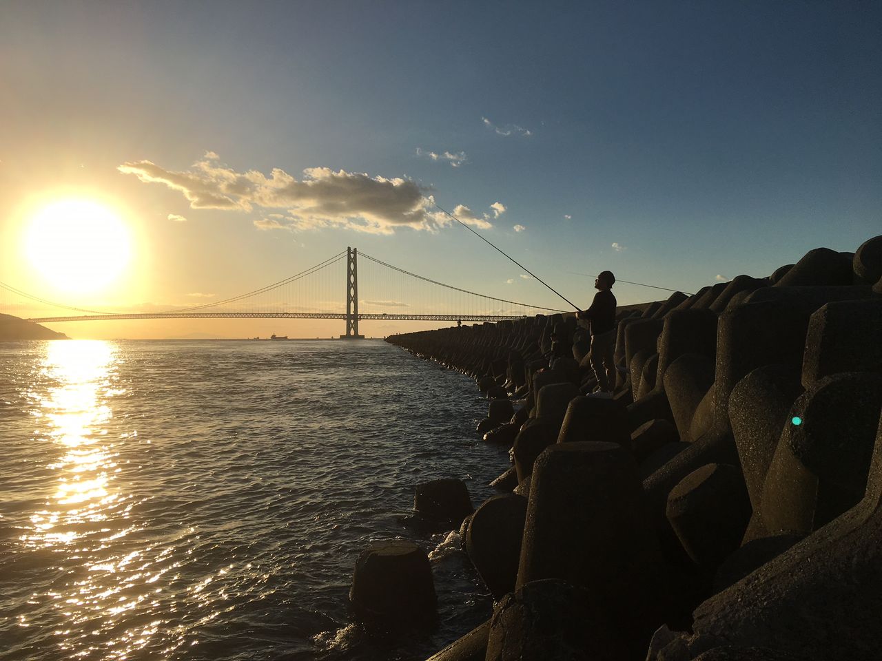 バックの明石大橋のイルミネーションがうっすらと写っている。